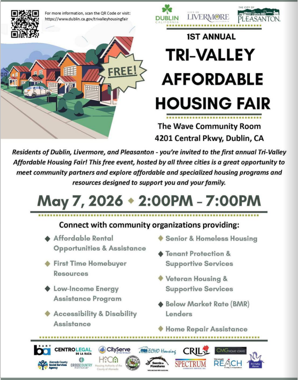 Residents of Dublin, Livermore, and Pleasanton are invited to the first annual Tri-Valley A/fordable Housing Fair! This free event, hosted by all three cities is a great opportunity to meet community partners and explore affordable and specialized housing programs and resources designed to support you and your family.