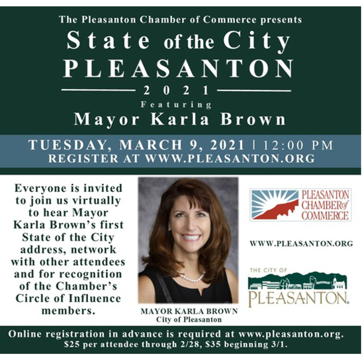 The Pleasanton Chamber of Commerce presents State of the City Pleasanton 2021, featuring Mayor Karla Brown. Everyone is invited to join virtually to hear Mayor Karla Brown's first State of the City address, network with other attendees and recognize the Chamber's Circle of Influence members. This is a great community event and an opportunity to learn more about what is happening in Pleasanton. The Pleasanton Chamber of Commerce is organized to benefit business by creating and promoting economic opportunity, strengthening and educating its members and the community, and influencing public policy.