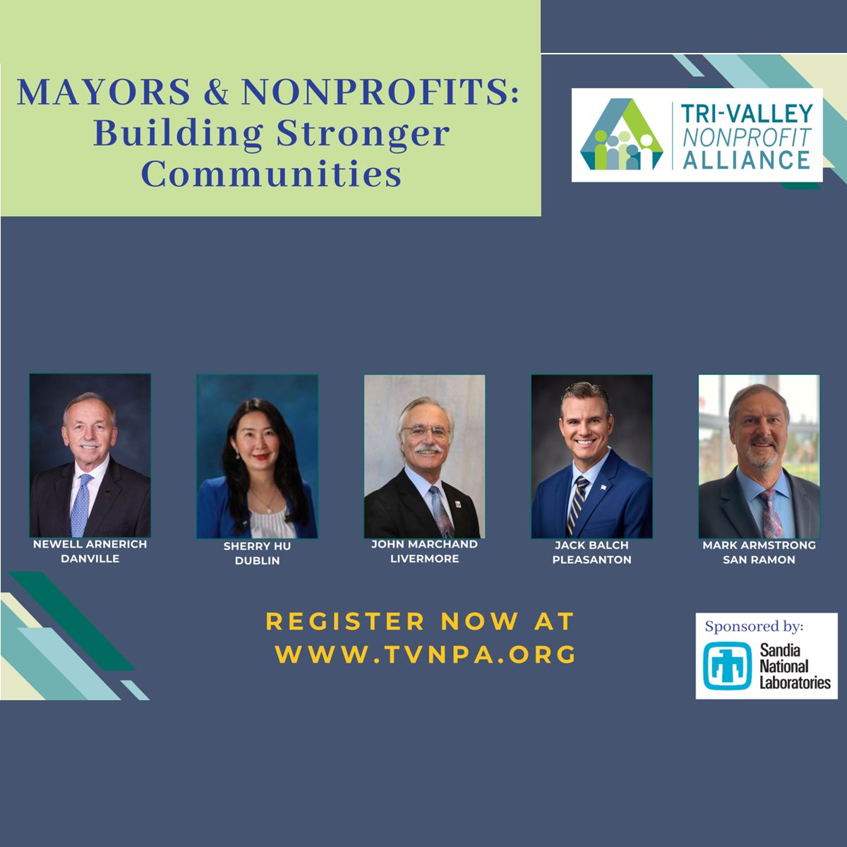 Join the TVNPA and the Tri-Valley community at the upcoming event, Mayors & Nonprofits: Building Stronger Communities. TVNPA will bring together local leaders for the return of the annual Mayors’ Panel on Wednesday, March 18, 2026, from 10:00 am to 12:00 pm at The Bankhead Theater, 2400 First Street in Livermore. This conversation will offer insight into local priorities, the critical work being done by nonprofits, and opportunities for cross-sector collaboration. The program offers an opportunity to hear directly from the region’s mayors, and to better understand how collective efforts at the local level can create lasting impact. This special presentation will feature: Newell Arnerich, Town of Danville; Sherry Hu, City of Dublin; John Marchand, City of Livermore; Jack Balch, City of Pleasanton; and Mark Armstrong, City of San Ramon. In addition, the event will open with a reception and networking opportunity.