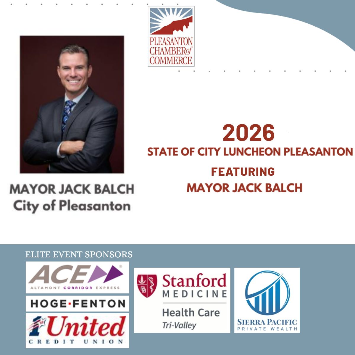 The Pleasanton Chamber of Commerce presents State of the City of Pleasanton 2026, featuring Mayor Jack Balch. Everyone is invited to hear Mayor Balch's special Pleasanton update, network with other attendees and recognize the Chamber's Circle of Influence members. This is a great community event and an opportunity to learn more about what is happening in Pleasanton. The Pleasanton Chamber of Commerce is organized to benefit business by creating and promoting economic opportunity, strengthening and educating its members and the community, and influencing public policy.